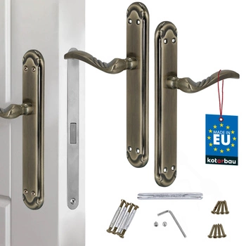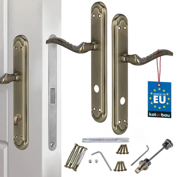 Klamka drzwiowa długi szyld zdobiona patyna zamek wc 72 mm